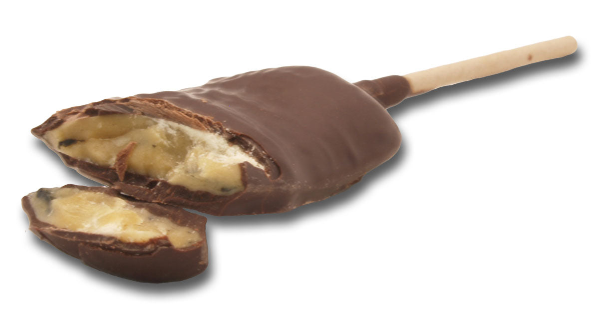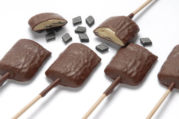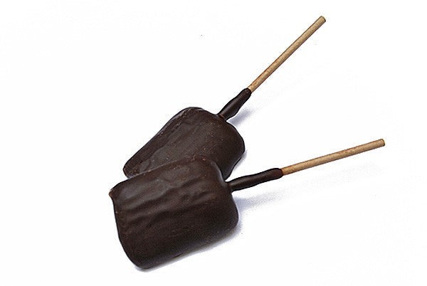 Drumherum dick Zartbitter-Schokolade und der Kern besteht aus einer Salmiak-Lolli-Grundmasse, gespickt mit kräftigen Lakritz-Salmis.