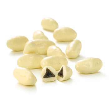 OJ Choklad Lakritzboote weiße Schokolade sind längliche, dragierte Schokoladen-"Boote" aus weißer Schokolade mit einem herzhaften Salzlakritzkern.