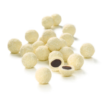 OJ Choklad Lakritzkugeln, Kokos bestehen aus einem herzhaften Salzlakritzkern mit einem Überzug aus feiner, weißer Schokolade und Kokosflocken.