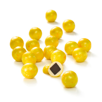 OJ Choklad Lakritzkugeln, Zitrone sind feine, dragierte Schokoladenkugeln aus weißer Schokolade mit einem herzhaften Salzlakritzkern und Zitronengeschmack.